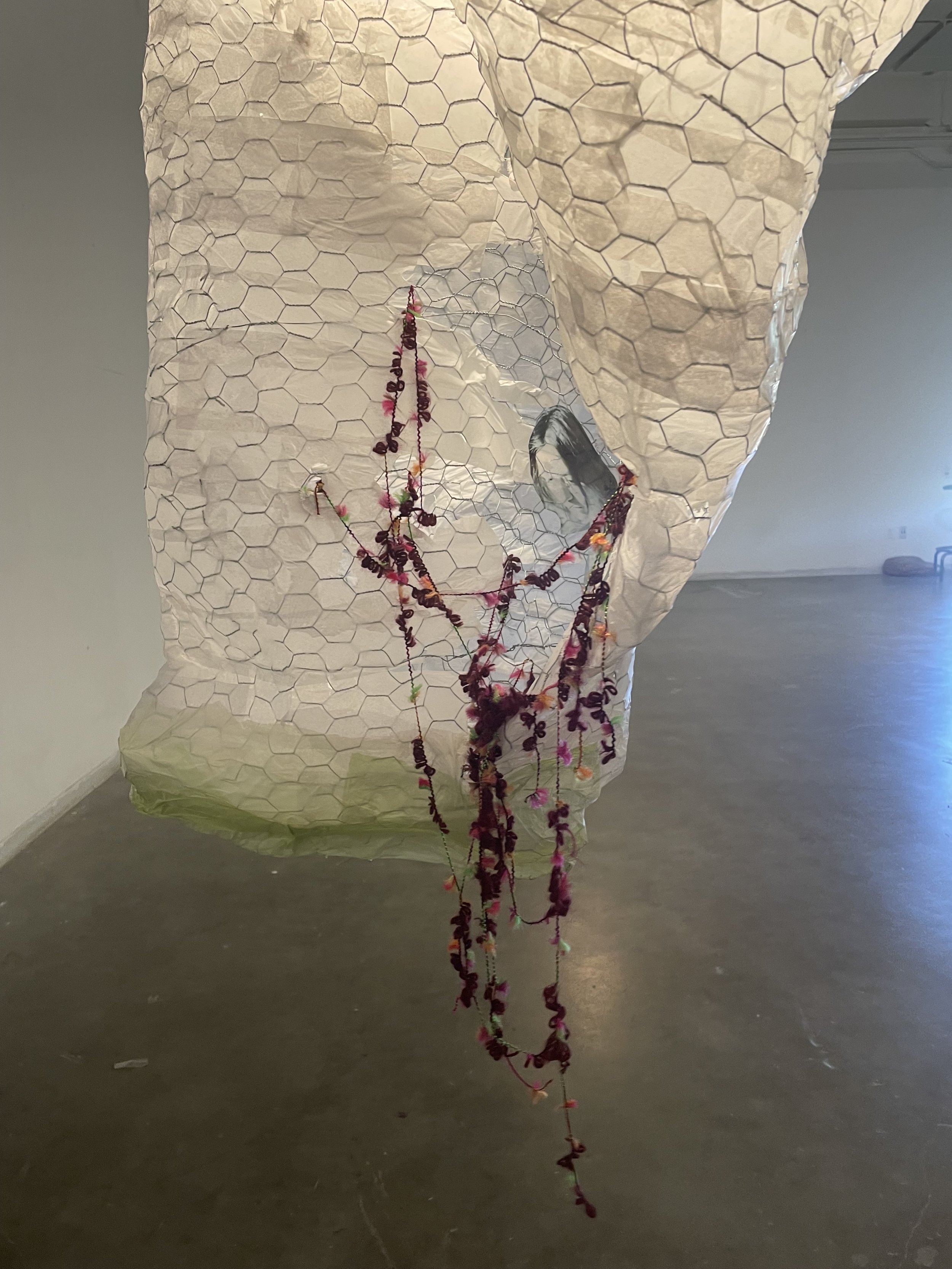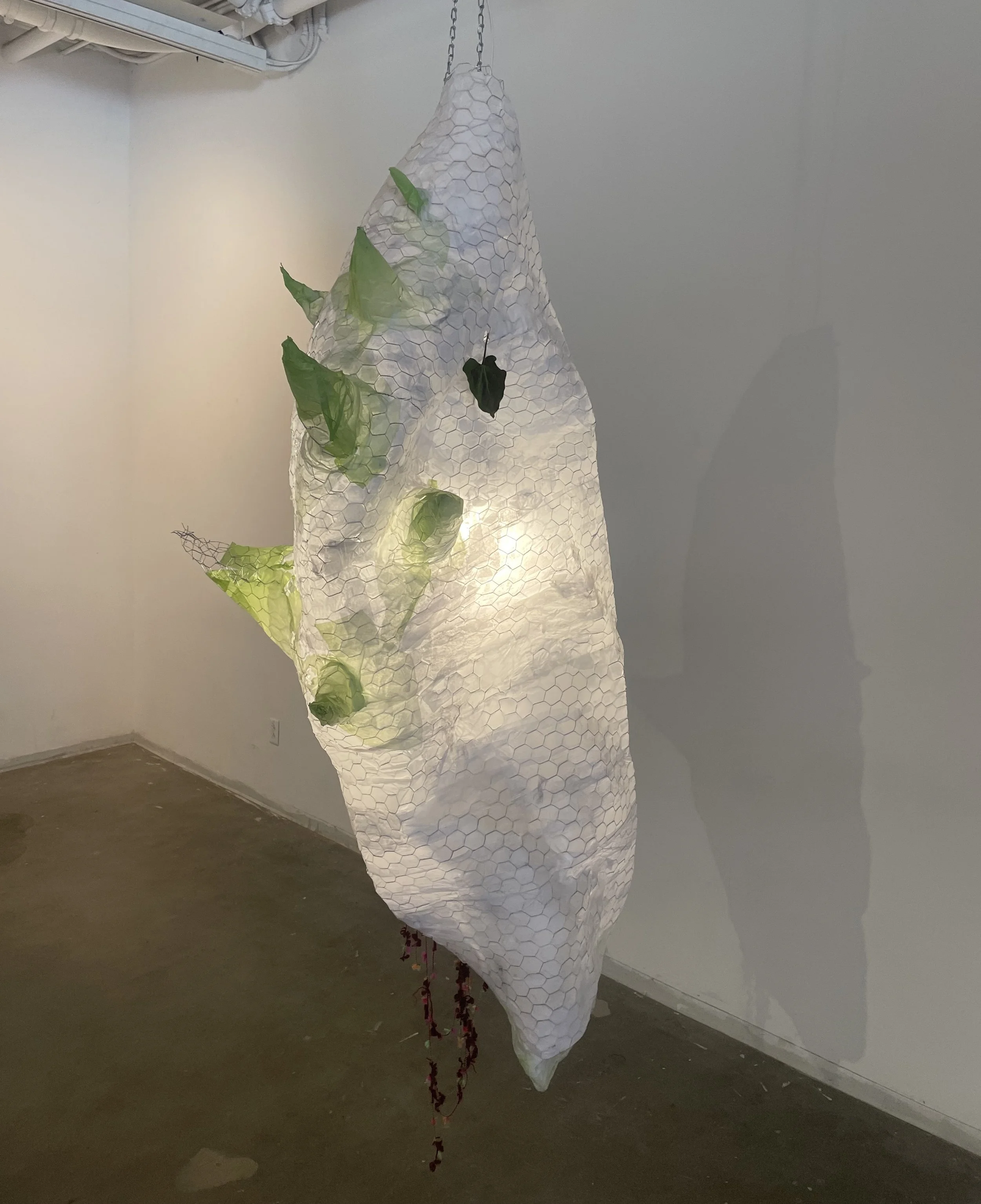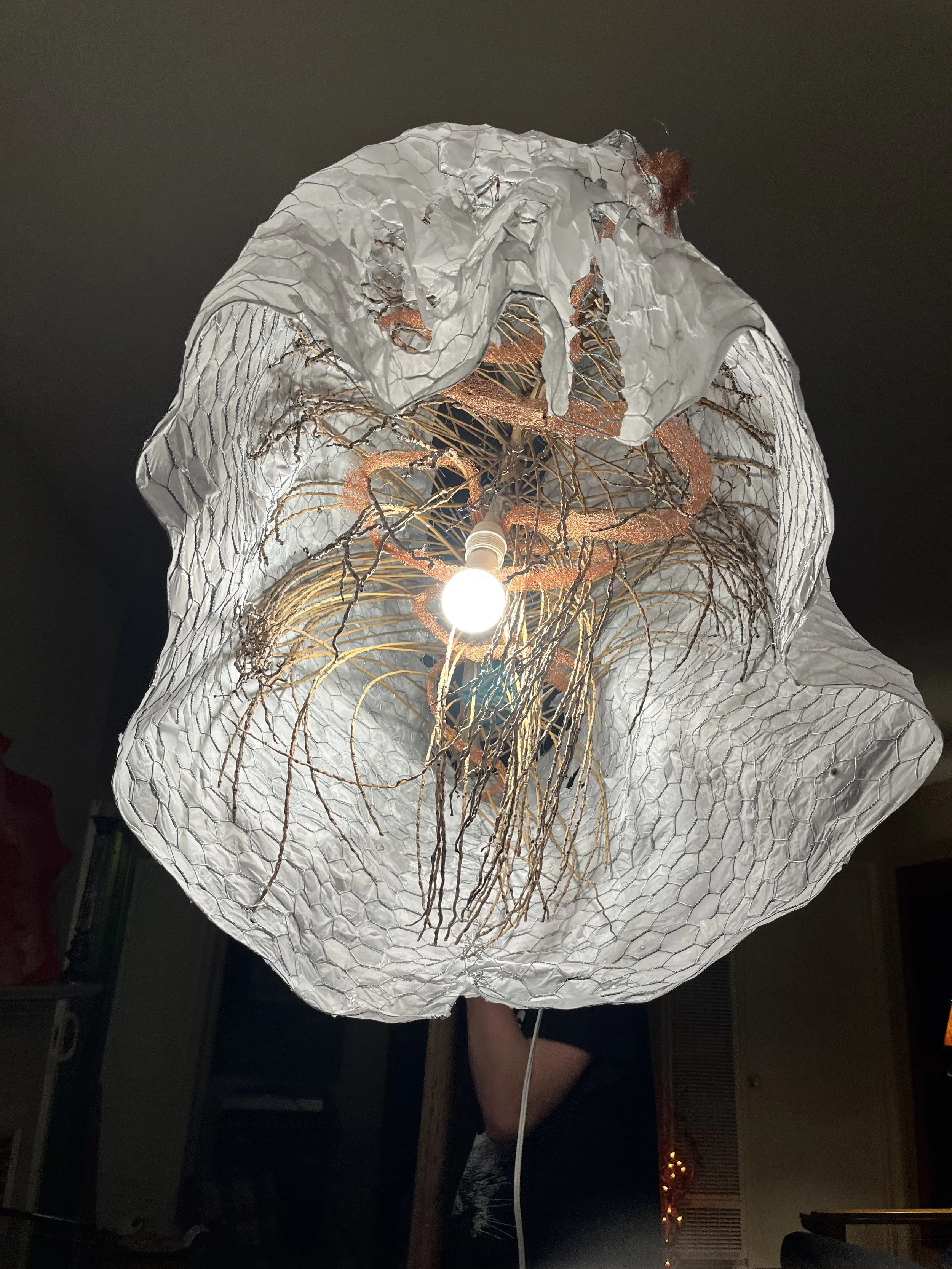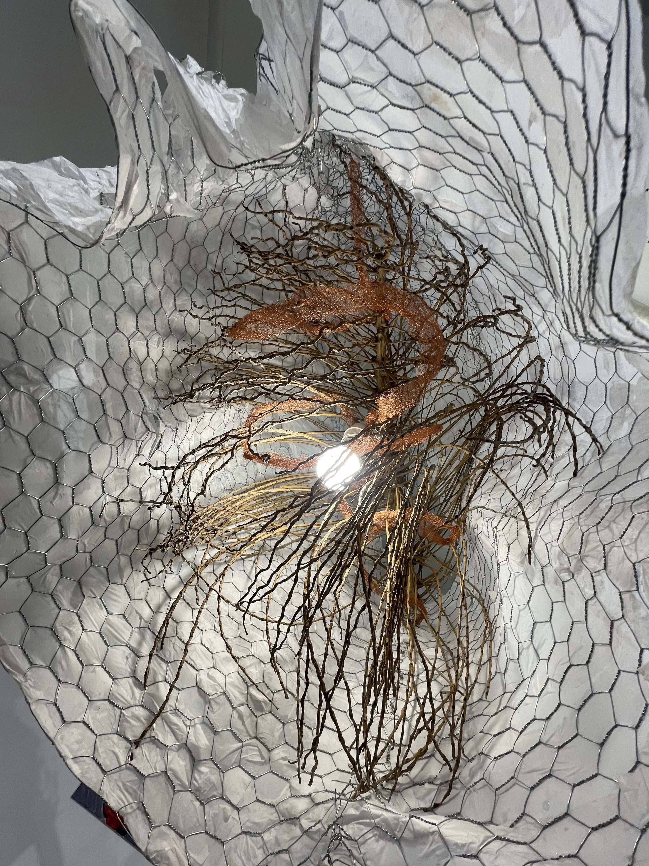 chicken wire, tissue paper, copper mesh, dead palm branch, chain, light bulb